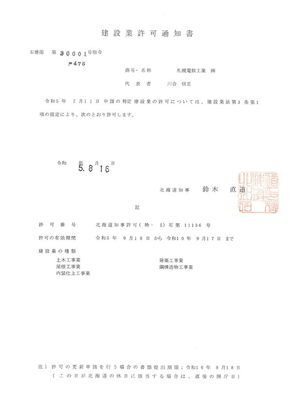 | 営業品目 | ■Rグレード認定工場(国土交通大臣認定工場) ・建築鉄骨の生産・供給 ■溶融亜鉛めっき加工(日本産業規格表示認証工場) ■設計・製作・施工 ・送電鉄塔 ・無線鉄塔 ・各種鉄構架台 ・アンテナ支持柱 ・太陽光発電設備架台 ・温室、プール鉄骨上屋 ・軽量鉄骨 ・カメラ支柱 ・道路情報板支柱 ・情報ボックス金物 ・高欄 ・フェンス ・歩道柵 ・柵渠 ・道路遮断機 ・標識柱 ・照明柱 ・北海道電力認定各種架線装柱金物一式 ・建築用鋼製下地材 ・耐震クリップ |